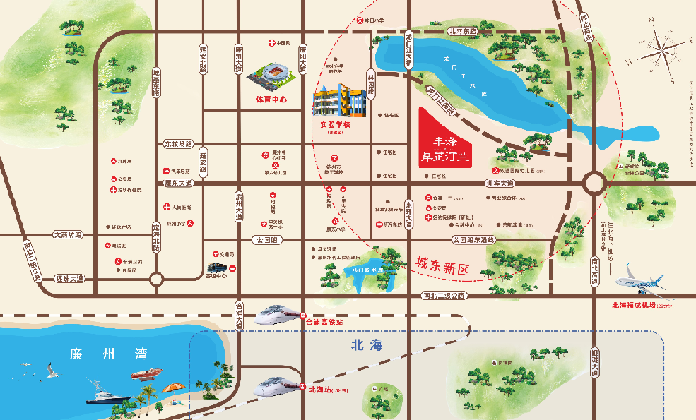 作为合浦新的政治、经济、文化、金融中心,城东新区将规划合浦首个中央商务区(CBD),成为未来5年主要发展区域。项目占据城东主心位置,向北依托千亩龙门江公园,向西直达老城繁华中心,南临未来政务中心,丰盛资源触手可及;东接高速入口,城东客运站助力,多维交通成就高效城市生活圈。城市主干道迎宾大道、东环大道及科园路,形成“一横两纵”迅捷交通网络,擎动城市升级。