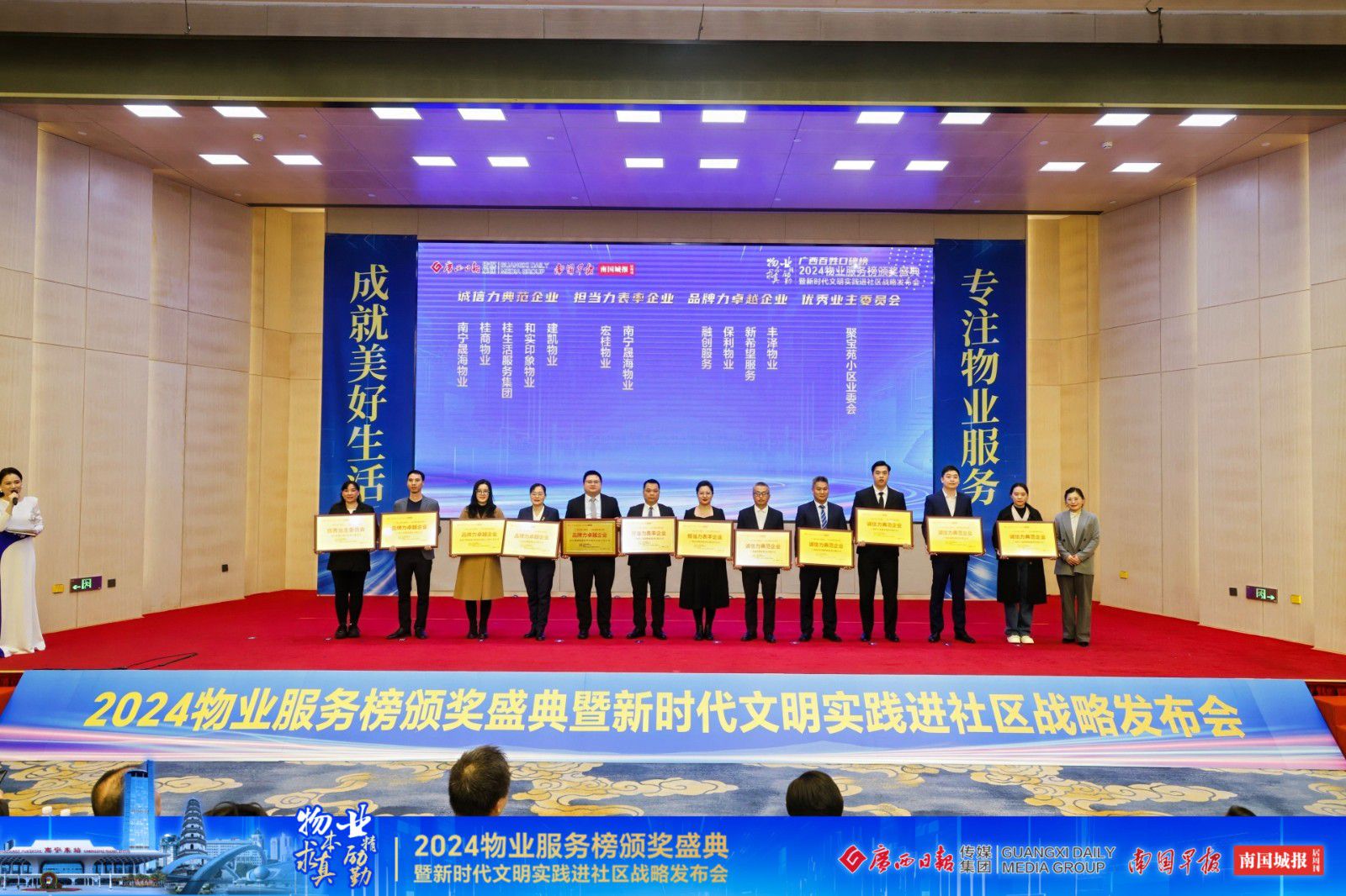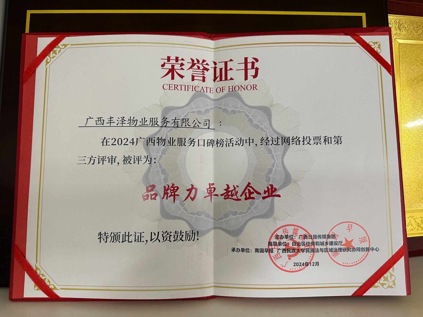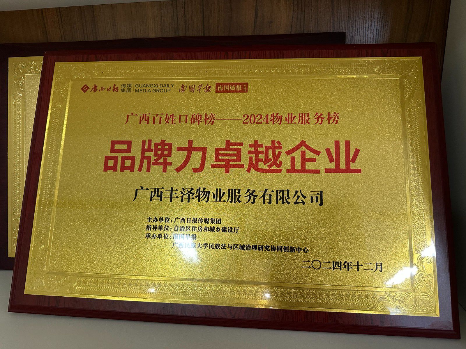 2024年12月,“广西百姓口碑榜——2024物业服务榜”颁奖盛典暨新时代文明实践进社区战略发布会在南宁盛大举行。丰泽物业凭借别墅级的服务品质和口碑,以及卓越的企业综合实力,在众多参评企业中脱颖而出,获得2024广西物业服务榜“品牌力卓越企业”大奖。