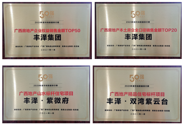 丰泽集团以13.95亿元的销售金额,在广西众多本土房企中脱颖而出,跻身广西房企TOP50 &本土房企TOP20,实力荣膺五项殊荣,不负众望。